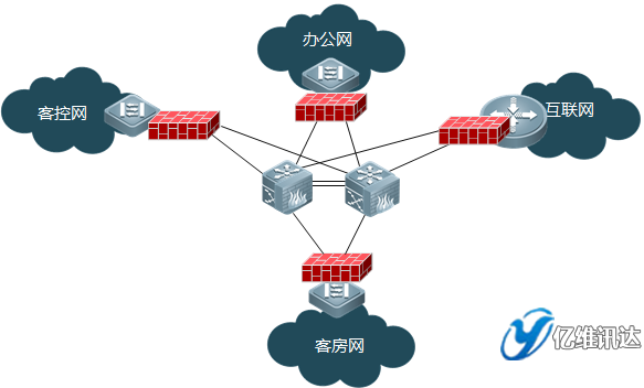 通過銳捷核心交換機的防火墻模塊的虛擬防火墻功能,對客控網、客房網、辦公網進行安全防護,將病毒/攻擊隔離在本地,不影響其他區塊正常運行。