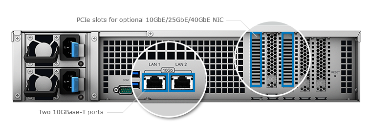 FS3017 內建雙 10GBase-T 網絡端口。當你需要更多的帶寬時,可透過兩個 PCIe 插槽新增額外的網絡控制器,也可選擇 10GbE、25GbE 與 40GbE 網絡適配器以發揮 FS3017 的效能。此外,通過額外購買 FS3017 支持的網絡適配器,iSCSI over RDMA 技術更可進一步強化約 80% 的 iSCSI 效能。