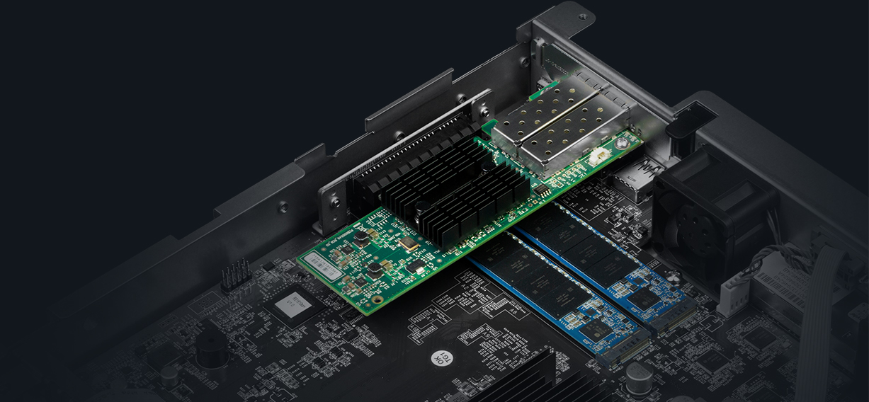 配備 PCIe 3.0 插槽,RS1619xs+ 支持安裝 10GbE/25GbE NIC 以實現快速數據傳輸。內置 M.2 2280 SSD 緩存插槽能進一步增強 IO 密集型任務,如虛擬化或郵件服務器部署。