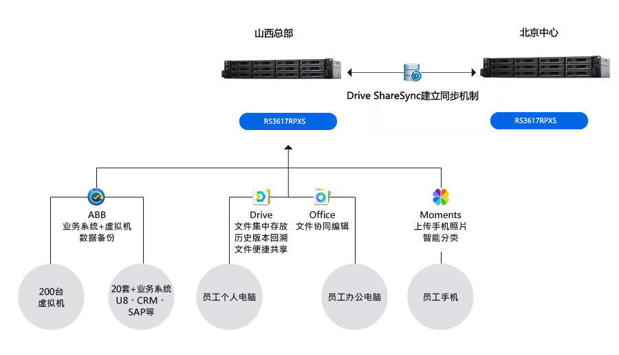 一份備份數據對公司的安全需求來說還不夠,借用群暉又進一步打造了異地備份容災方案。振東制藥山西總部的 RS3617RPXS 的備份數據,通過群暉 Drive ShareSync多分點同步功能復制到北京分公司的 RS3617RPXS 中。支持排程備份計劃。