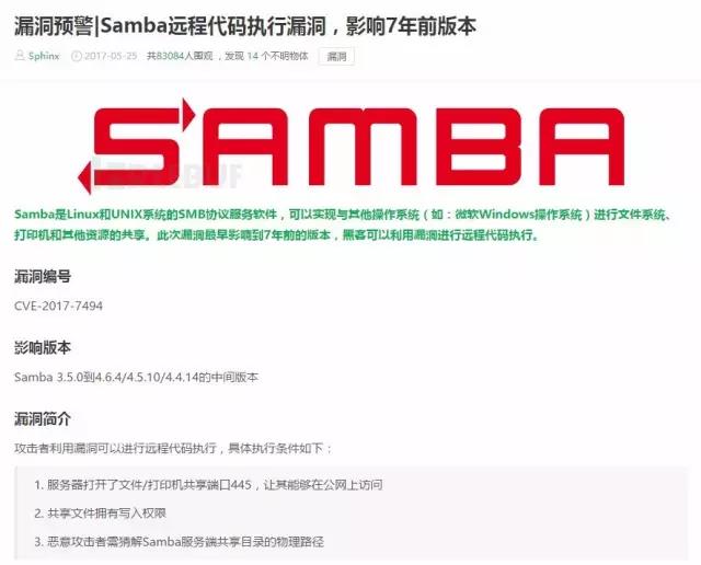 【群暉快報】2017年5月24日Samba發布了4.6.4版本,修復了一個嚴重的遠程代碼執行漏洞,漏洞編號CVE-2017-7494。安全漏洞可以讓一個有權限的用戶提權至Samba所在服務器的root權限,進而執行惡意程序,向該服務器發動攻擊。