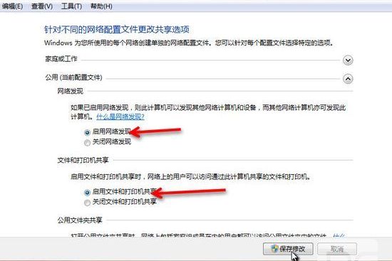 選擇 公共網絡---選擇以下選項:啟動網絡發現------啟動文件和打印機共享-----啟用共享以便可以訪問網絡的用戶可以讀取和寫入公用文件夾中的文件(可以不選)----關閉密碼保護共享( 注釋:其他選項默認即可!)